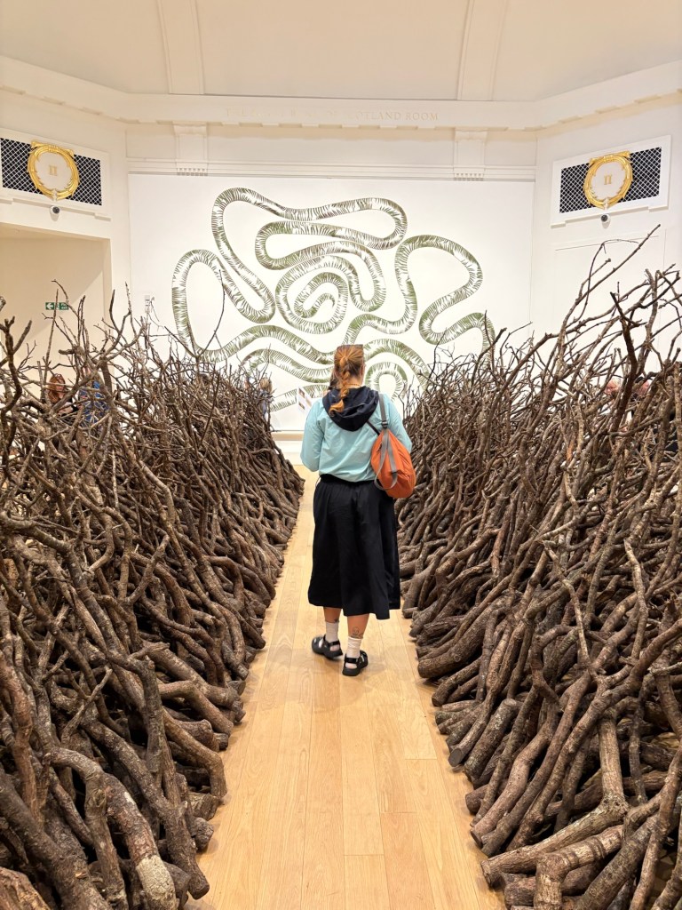 The first room was a corridor of branches, densely packed, rising waist-high on either side like walls made of tangled bone. Neatly arranged, geometric but still wild. Not decorative, not pretty – more like a structure nature might’ve made on its own if it cared about symmetry. I thought we were about to enter a garden?