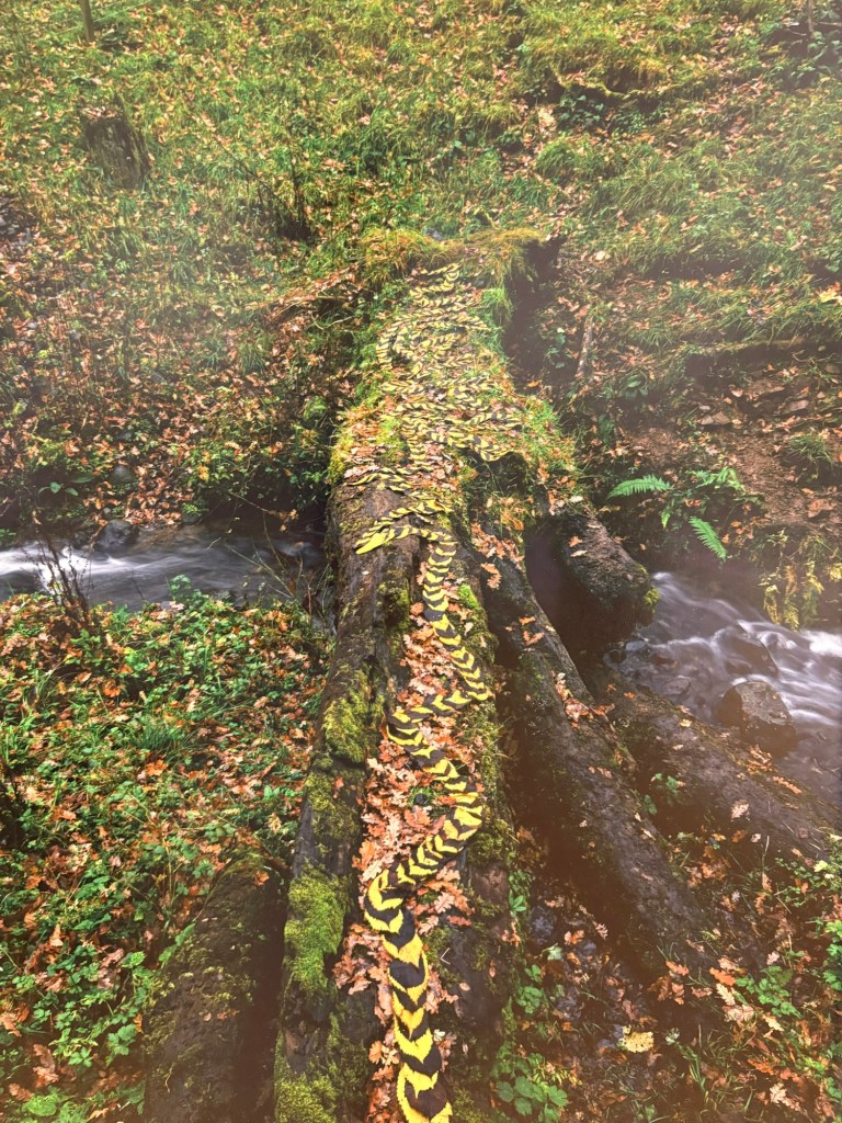 I kept thinking about gardening and what it means to me as we walked farther. Not as a hobby, but as a form of composition. It’s one of the few crafts where the material has its very strict timeline and main constrain is that you can’t fully control it. You guide it and it grows back in its own way. Same with Andy’s work– it doesn’t try to dominate nature, it simply follows it, listens to it, sometimes just frames it so we can see it better. Just like these branches or leaves followed the shape of the fallen tree: