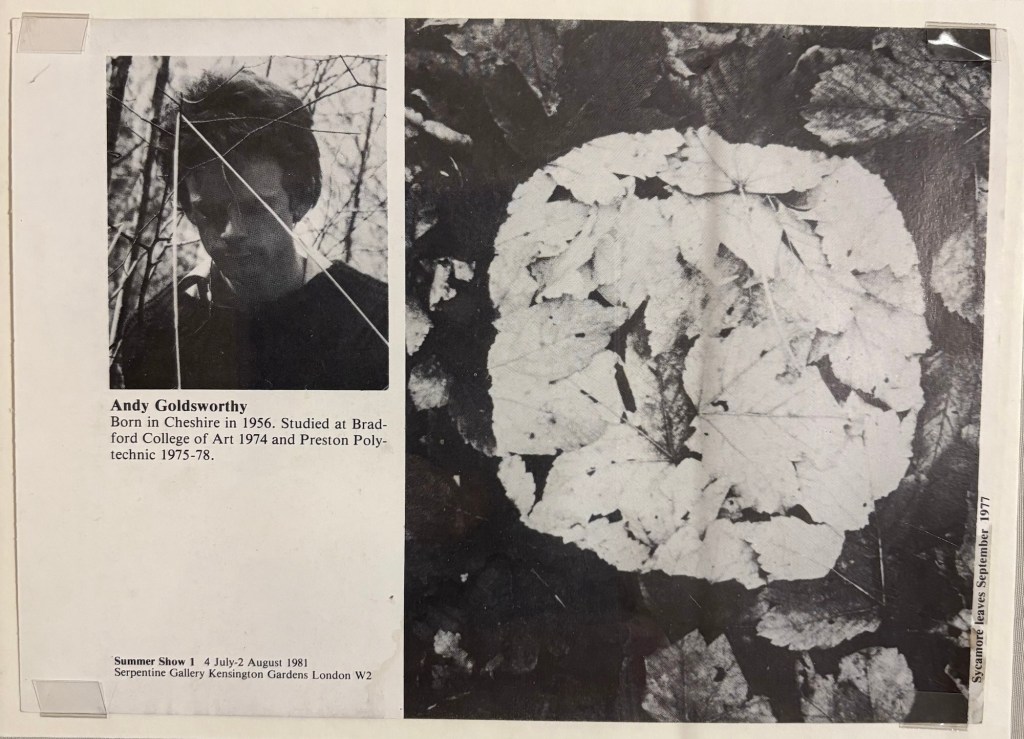 I worked as a gardener once, back in 2014 near the Forest of Dean. Andy reminded me about this fantastic experience. I remember the slow transition from autumn to winter. The way decay took over everything – yellow leaves turning brown, the first frost hardening them like paper sculptures. I remember wanting to shape those moments somehow, to keep them. I had no tools, just the impulse to notice. Andy didn’t just notice – he turned that impulse into a practice.I’m pretty sure leaves his main inspiration, but I couldn’t find confirmation… except this little note from his early works:
