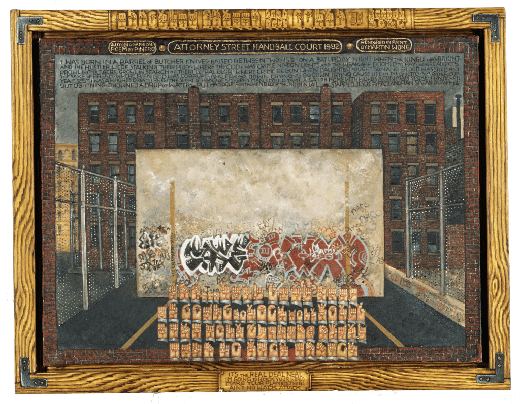 Ten years ago I was still forming my idea of what an artist is. Probably someone from the deep past. Like my early obsession with Leonardo da Vinci and his mix of engineering and painting. What I did not know then is that Martin Wong would sink into my consciousness so deeply that my nightmares and my romantic dreams would be built from his walls, his sign language, his rounded hands, his windows. I believe Martin wanted this – to live inside people’s heads. Maybe this was his real goal?